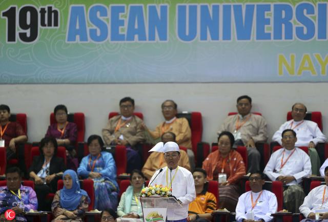 Vice President U Myint Swe delivers the closing speech at the Closing Ceremony of 19th ASEAN University Games in Nay Pyi Taw yesterday.